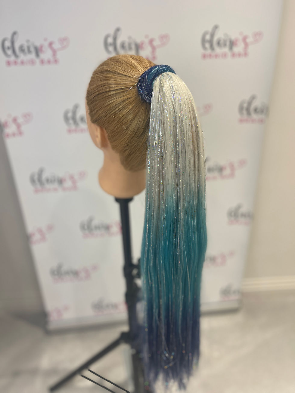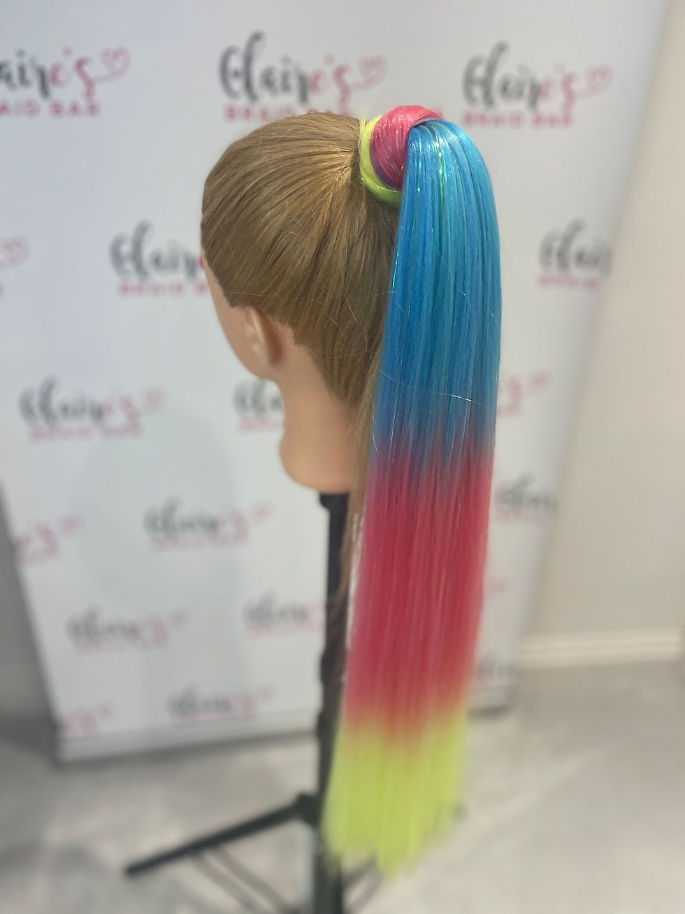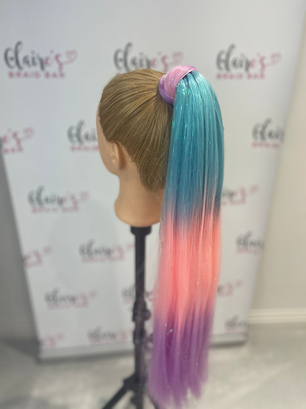INSTRUCTIONS Mermaid Magic clip in multicoloured jumbo hair braid extension for girls - reusable and easy to attach, the perfect gift and accessory! Say hello to effortless mermaid hair every day with your mer-mazing handmade braid extension from Claire’s Braid Bar, celebrity braid supplier to the stars (star) Our stunning attachable braid extensions are designed for easy application and hassle-free wear. Plus they’re reusable so you can have INCREDIBLE hair whenever you want!  (recycle sign, star with dots) Perfect for kids who love trying different hairstyles without damaging their natural hair [Plus they’re reusable, so you can switch up your style whenever the mood strikes! (recycle sign, star with dots) OR so you can have INCREDIBLE hair whenever you want. Our braids are so easy to attach and can be re-used over and over again, so you can have INCREDIBLE hair whenever you want. Perfect for kids who love trying different hairstyles without damaging their natural hair] Also available in other fabulous styles, the list is endless, see our other listings for examples. AND THEY CAN BE CUSTOM MADE TOO - just let us know your favourite colours and we can make one just for you! These are perfect for themed parties (eg Disney, unicorn, mermaid), festivals, holidays, concerts, cosplay, dress-up, any occasion! They make fabulous gifts and going home presents too!  We also offer wholesale for event organisers, please get in touch to discuss. Product Specifications: 100% handmade and crafted to order by our braid artists using the finest synthetic hair. We use premium quality hair and a superior method of stitching our braids to ensure they are secure and long-lasting. We have many happy returning customers who appreciate the quality of our workmanship. Styling Instructions: Super easy to attach in 3 simple steps (see video below): Make a small ponytail at the top of the head. Tie in the braid and let it fall forward over the face. Make a 2nd half ponytail at the ear. Lay the braid back over the hair and secure with pins if required. Hair care: Our attachable & re-usable hair extensions are all handmade and crafted by us with love, care and our trademark attention to detail. They can be used again and again if they are treated with proper care. To ensure they stay looking luscious, please follow our after care instructions. To prolong the life of your hair extensions, please store them separately from each other. Either hang them up or lie them flat when they are not being used to avoid tangles. If you notice stray hairs on the hair extension, you can trim them with scissors. If you have purchased a ponytail extension, you can gently comb it with your fingers or lightly brush it to untangle. Ensure you hold the ponytail by the tie points on the hair band (to avoid pulling the hair) and begin brushing at the bottom, working your way up the hair. Do not use a hair straightener or other heated appliance exceeding 150 degrees Celsius as this will damage the hair. Each set of braids are made to order and may differ slightly from the photos shown. Processing & Delivery All our hair extensions are handmade to order so please allow up to 7 days for processing plus postage time. Parcels are sent by tracked delivery and we charge the postage prices set by the delivery company (we do not profit from postage). All hair extensions are custom made to order and are non-refundable and non-exchangeable.